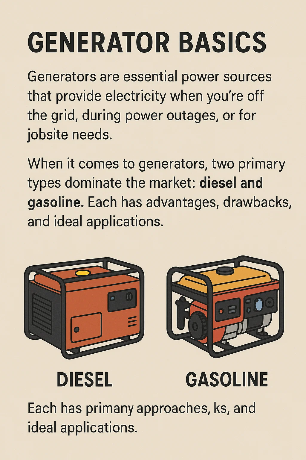 발전기의 경우 두 가지 주요 유형이 시장을 지배합니다. 디젤 그리고 가솔린 . 각각에는 고유한 장점, 단점 및 이상적인 응용 프로그램이 있습니다. 이러한 차이점을 이해하면 어느 것이 전력 요구 사항에 가장 적합한지 정보를 바탕으로 결정을 내리는 데 도움이 됩니다.